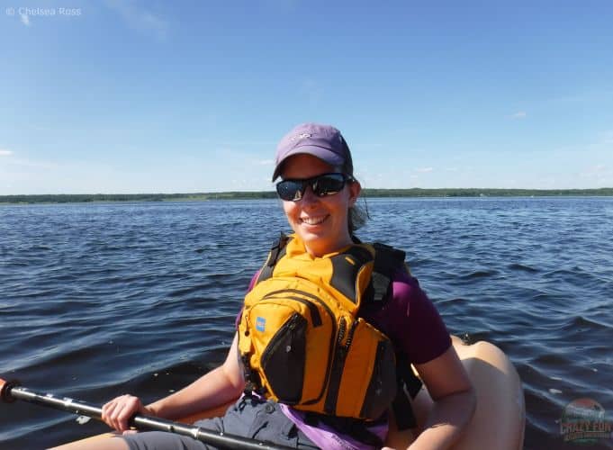 This MEC Fulcrum Guide PFD (Personal Flotation Device) is fantastic for kayaking! It’s comfortable to wear if a paddler’s body fits between XS (extra small) to XXL (extra extra large). A PFD takes the shape of a person’s body, which is ideal for continuous use. It’s shorter at the stomach, with adjustable straps at the shoulders. This is compared to a life jacket that is more of a one-size-fits-all rectangular shape. Its design provides additional flotation, helping you flip onto your back and keep your face out of the water. Reading up on both types is strongly recommended to see what suits your specific needs.